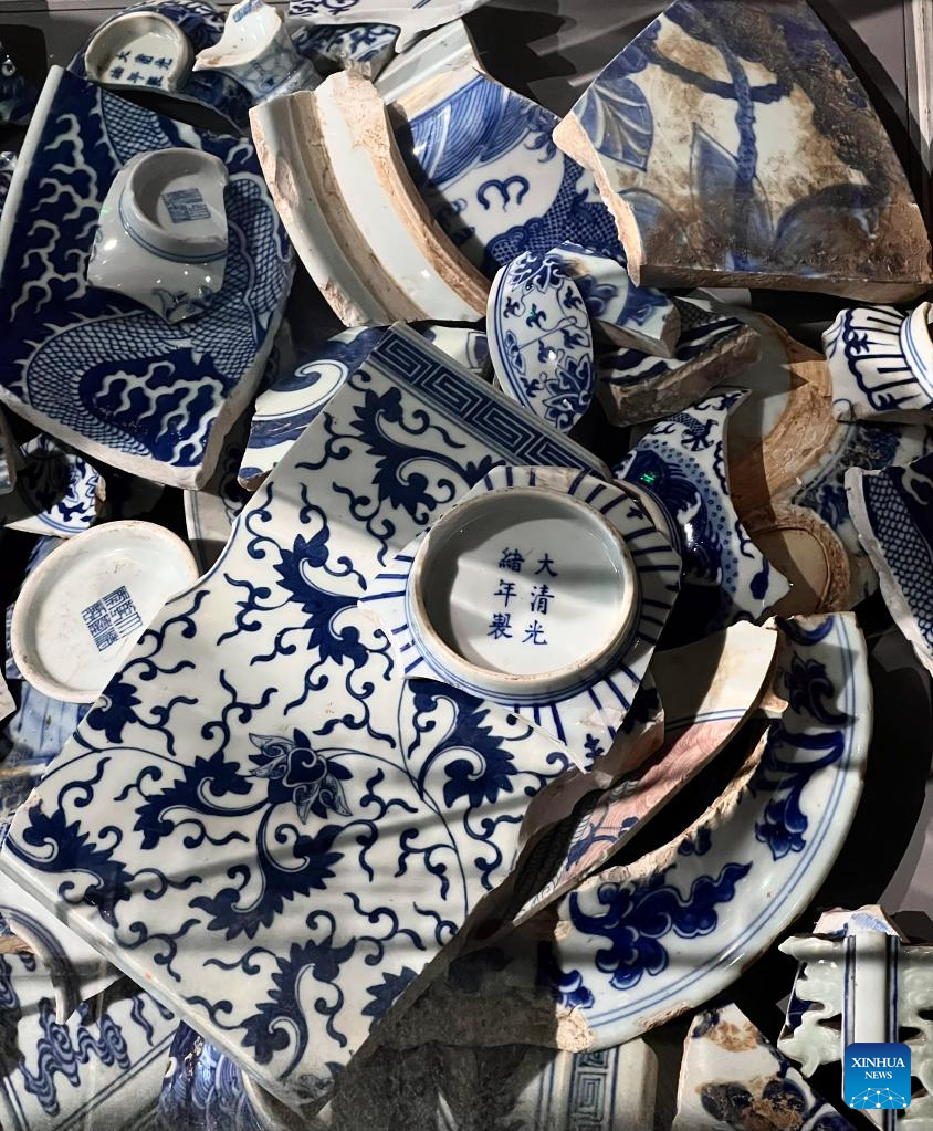 This photo taken on May 16, 2023 shows fragments of ancient porcelain displayed at Jingdezhen Imperial Kiln Institute in Jingdezhen, east China's Jiangxi Province. (Xinhua/Lu Zhe)
