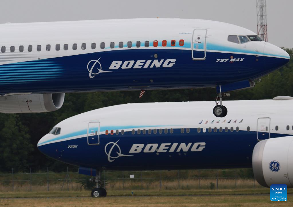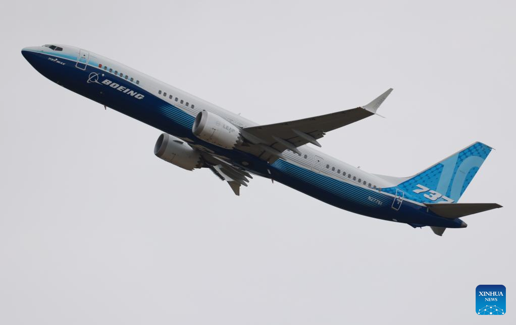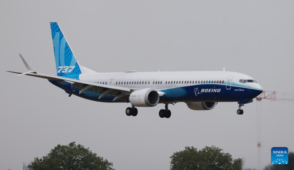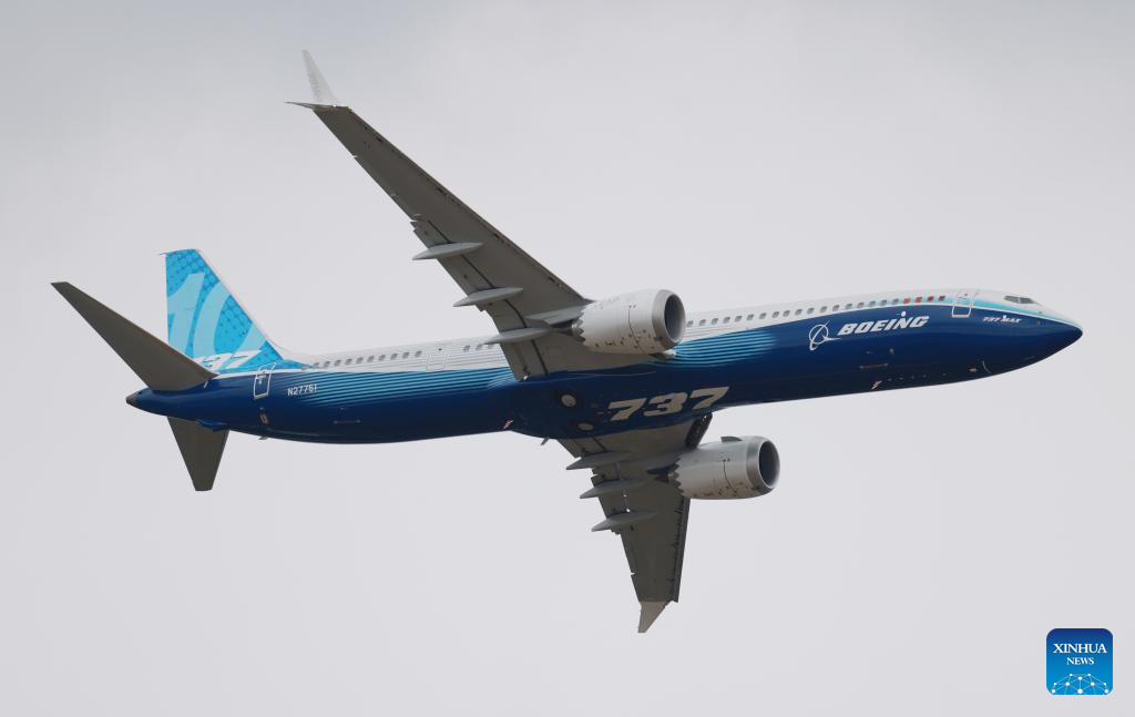 This photo taken on June 19, 2023 shows a demonstration of the Boeing 737-10 aircraft during the 54th International Paris Air Show held at Le Bourget Airport near Paris, France. The 54th International Paris Air Show kicked off here on Monday and will last to June 25, 2023. (Xinhua/Gao Jing)