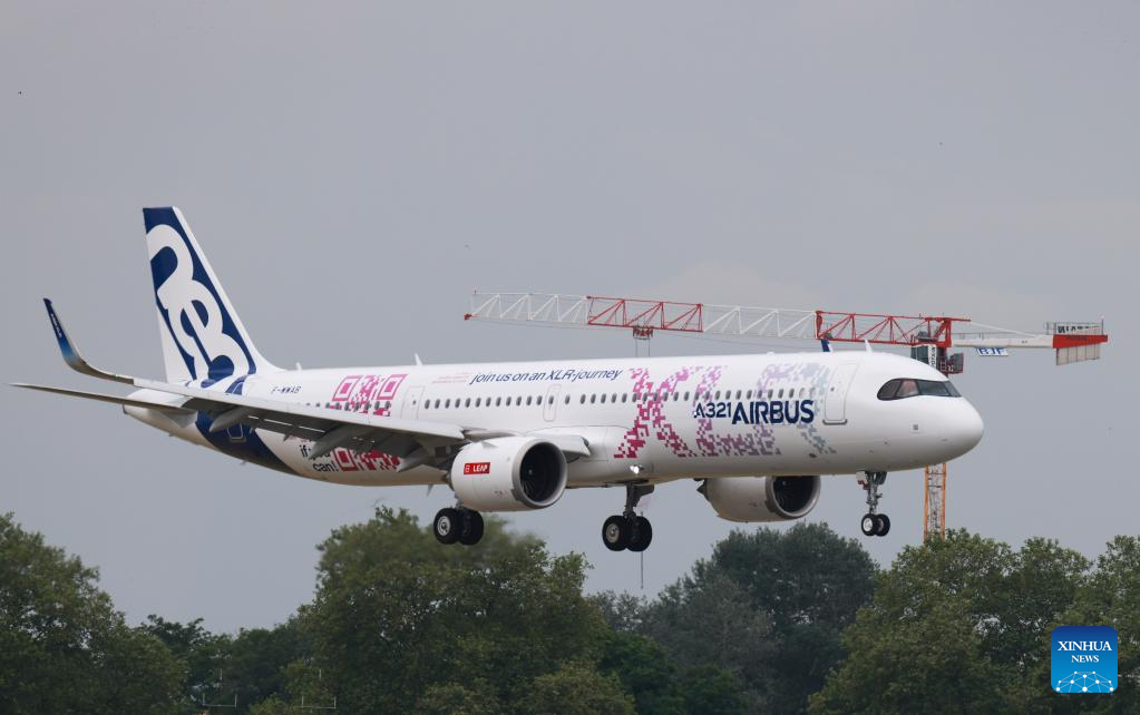 This photo taken on June 19, 2023 shows a demonstration of the Airbus A321 XLR during the 54th International Paris Air Show held at Le Bourget Airport near Paris, France. The 54th International Paris Air Show kicked off here on Monday and will last to June 25, 2023. (Xinhua/Gao Jing)