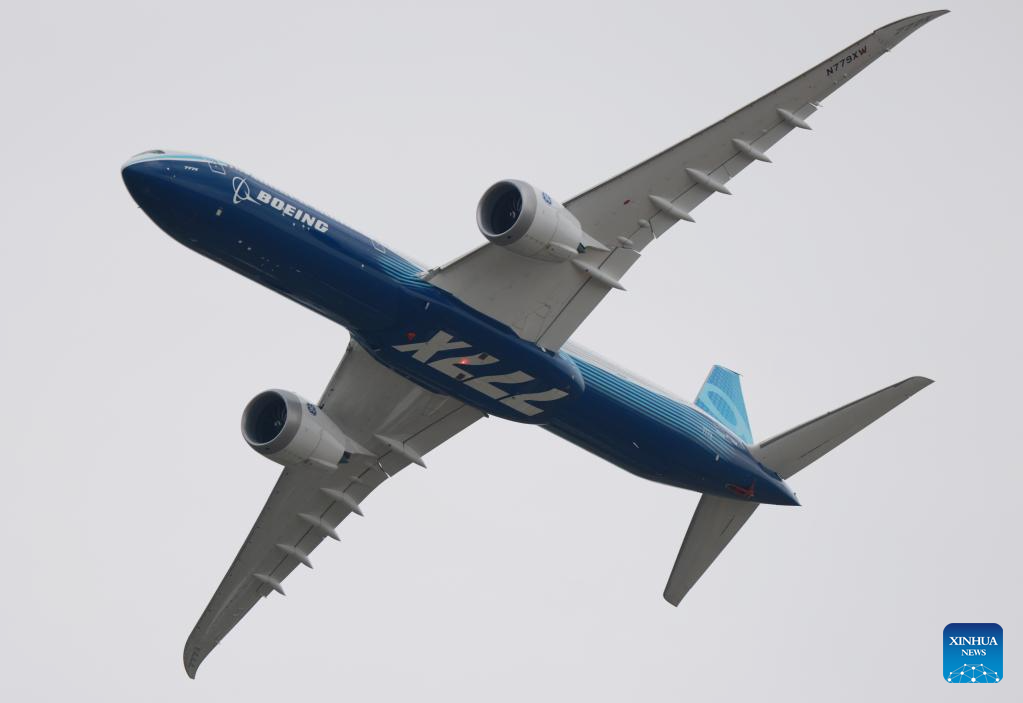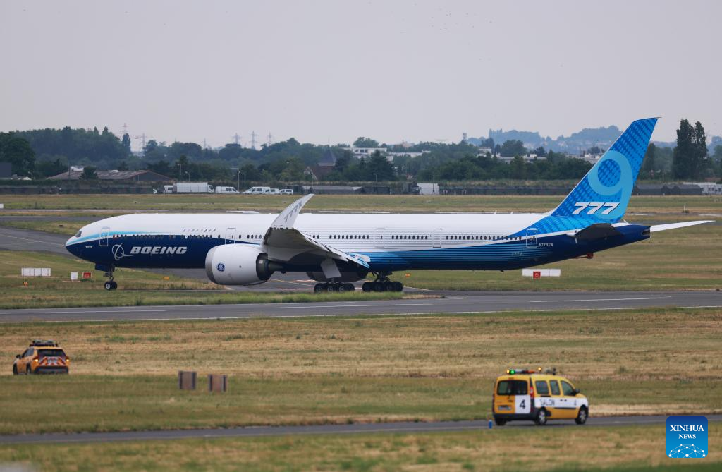 This photo taken on June 19, 2023 shows a demonstration of the Boeing 777X aircraft during the 54th International Paris Air Show held at Le Bourget Airport near Paris, France. The 54th International Paris Air Show kicked off here on Monday and will last to June 25, 2023. (Xinhua/Gao Jing)