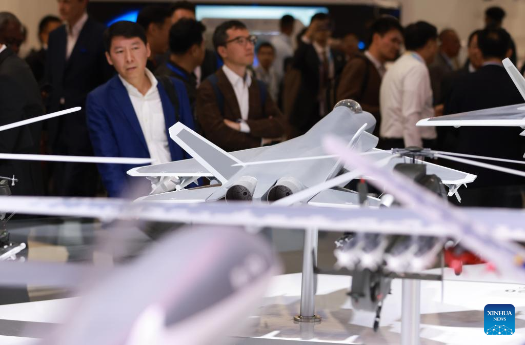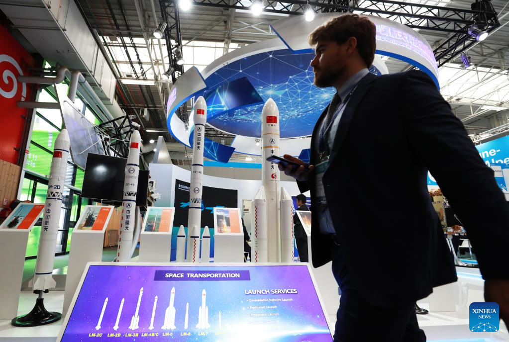 Visitors look at exhibits of China Aerospace Science and Technology Corporation (CASC) at the 54th International Paris Air Show held at Le Bourget Airport near Paris, France, June 19, 2023. The 54th International Paris Air Show kicked off here on Monday and will last to June 25, 2023. (Xinhua/Gao Jing)