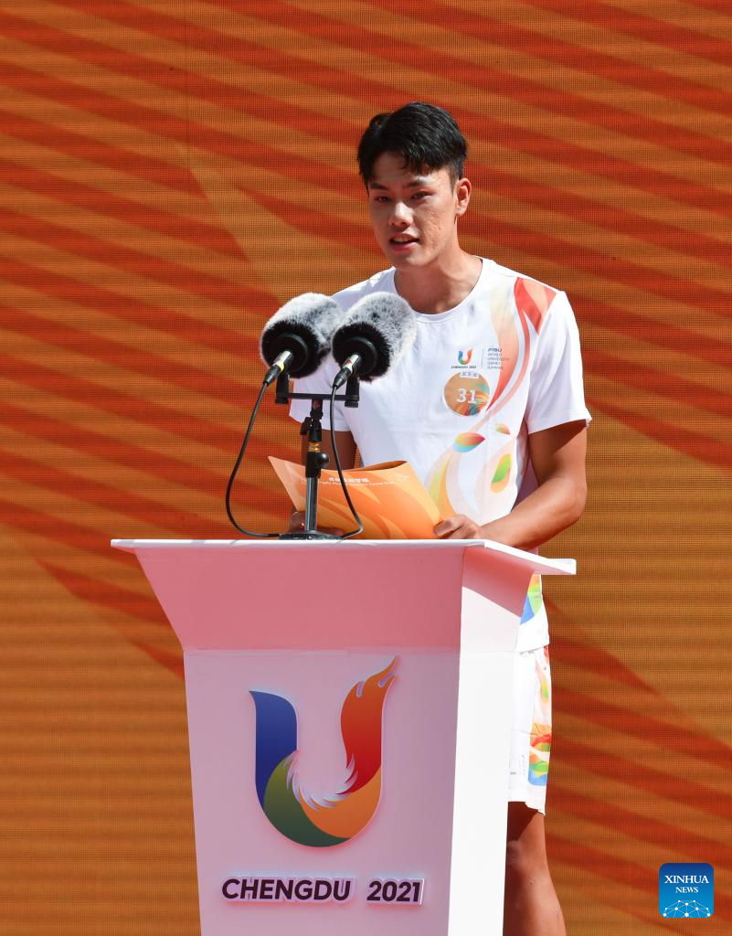 Torch bearer Wang Guanbin speaks prior to the torch relay of the Chengdu 2021 FISU Summer World University Games at Shenzhen University in Shenzhen of south China's Guangdong Province, on June 20, 2023. (Xinhua/Liang Xu)