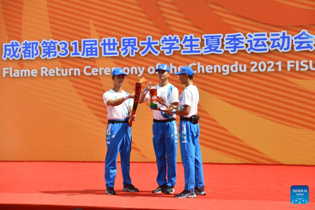 A guard collects the flame back to the lantern after the torch relay of the Chengdu 2021 FISU Summer World University Games at Shenzhen University in Shenzhen of south China's Guangdong Province, on June 20, 2023. (Xinhua/Liang Xu)
