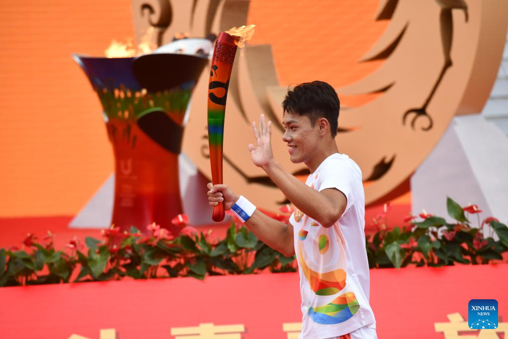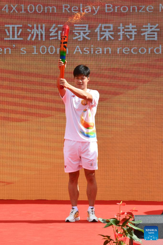 Torch bearer Su Bingtian holds the torch during the torch relay of the Chengdu 2021 FISU Summer World University Games at Shenzhen University in Shenzhen of south China's Guangdong Province, on June 20, 2023. (Xinhua/Liang Xu)