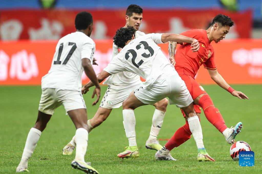 Xu Xin (1st R) of China breaks through during an international friendly football match between China and Palestine in Dalian, northeast China's Liaoning Province, June 20, 2023. (Xinhua/Pan Yulong)