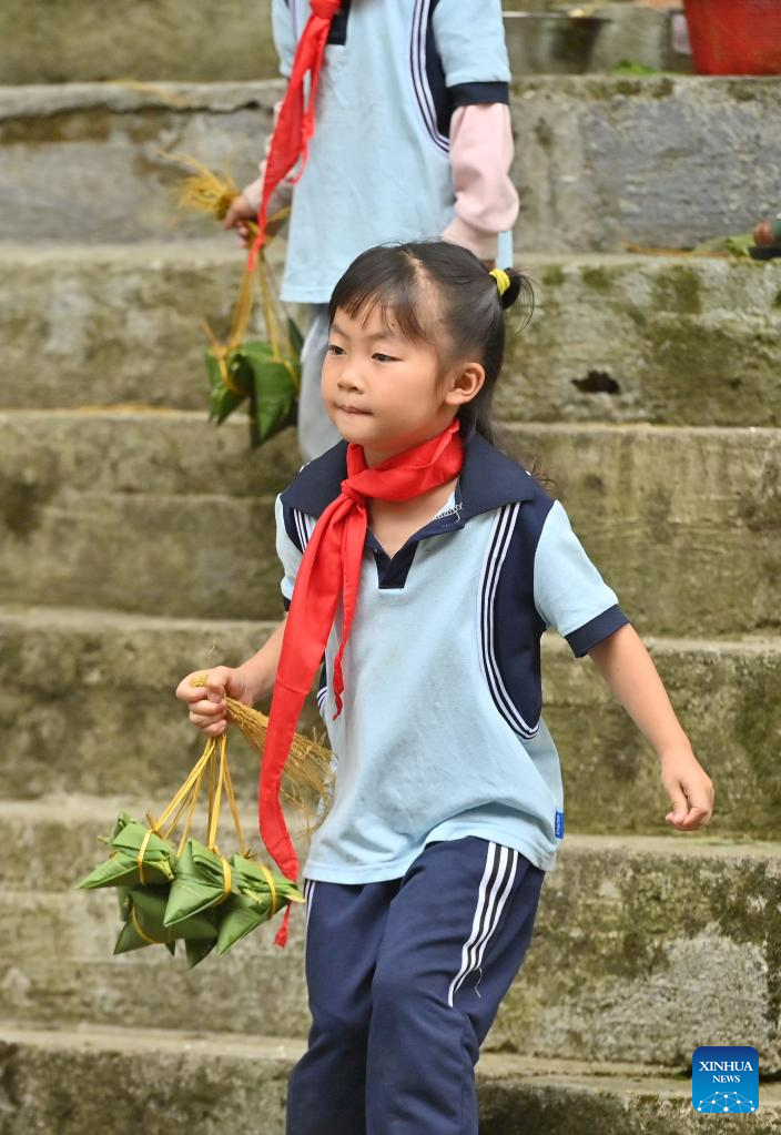 Students walk with freshly made Zongzi in Dangjiu Village, Gandong Township of Rongshui Miao Autonomous County, south China's Guangxi Zhuang Autonomous Region, June 20, 2023. (Xinhua/Huang Xiaobang)