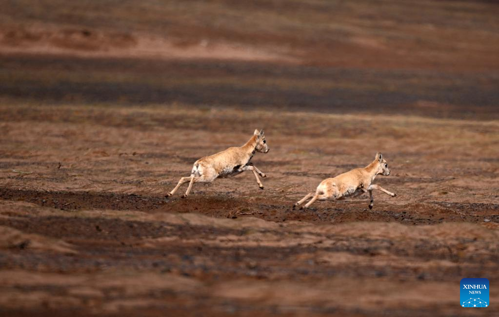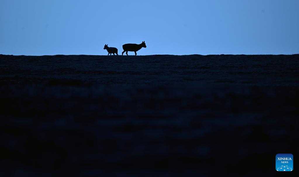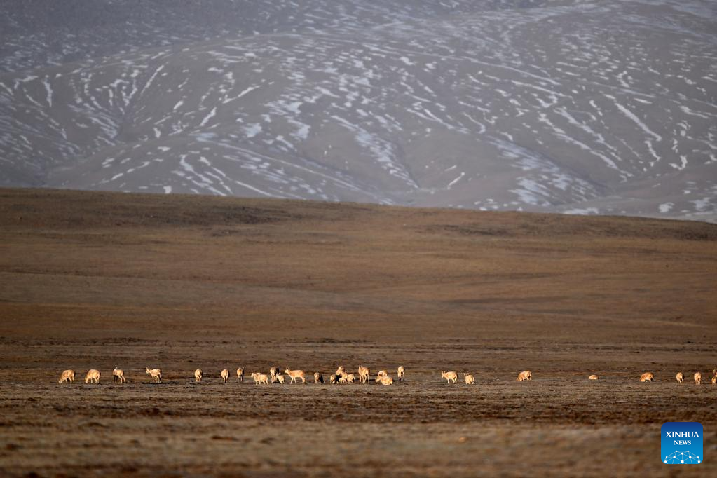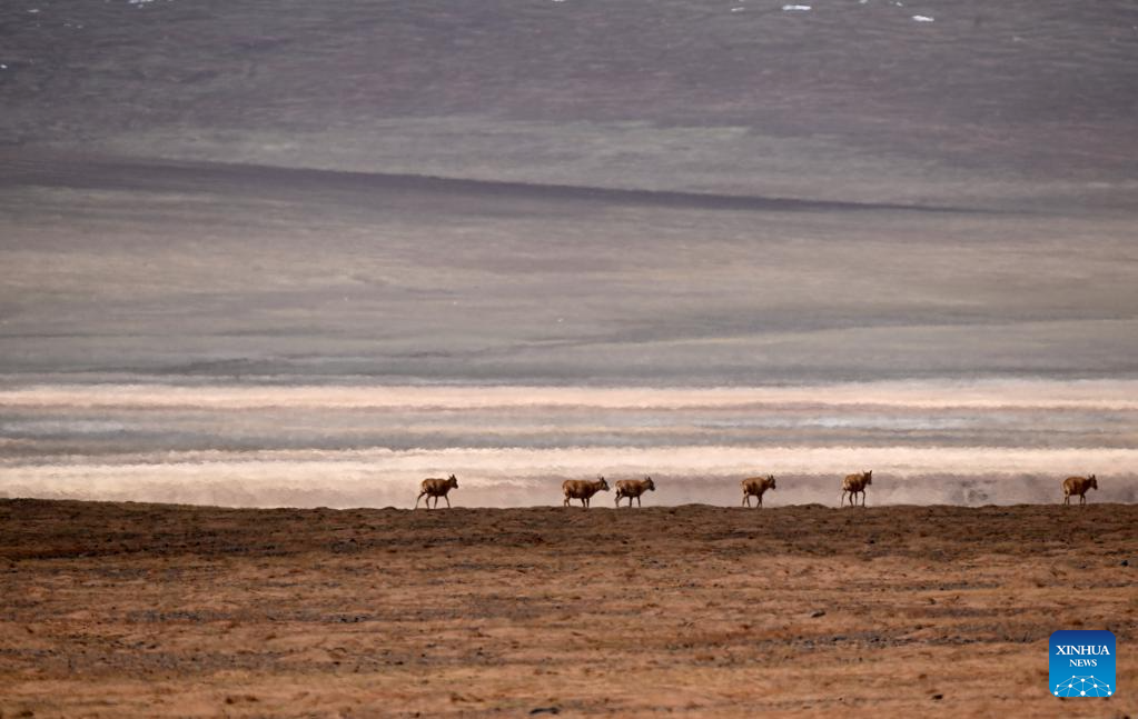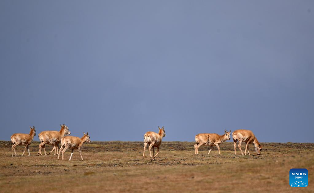 Tibetan antelopes are seen near the Zonag Lake in Hoh Xil, northwest China's Qinghai Province, June 17, 2023. The Zonag Lake region in the Hoh Xil National Nature Reserve boasts splendid views of snow mountains, lakes and grasslands. The region also serves as a vital birthing ground for pregnant Tibetan antelopes who arrive between May and July to deliver their offspring. (Xinhua/Zhang Hongxiang)