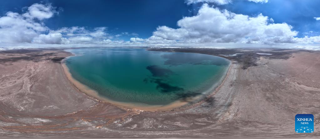This aerial panoramic photo taken on June 17, 2023 shows the Zonag Lake in Hoh Xil, northwest China's Qinghai Province. The Zonag Lake region in the Hoh Xil National Nature Reserve boasts splendid views of snow mountains, lakes and grasslands. The region also serves as a vital birthing ground for pregnant Tibetan antelopes who arrive between May and July to deliver their offspring. (Xinhua/Zhang Hongxiang)