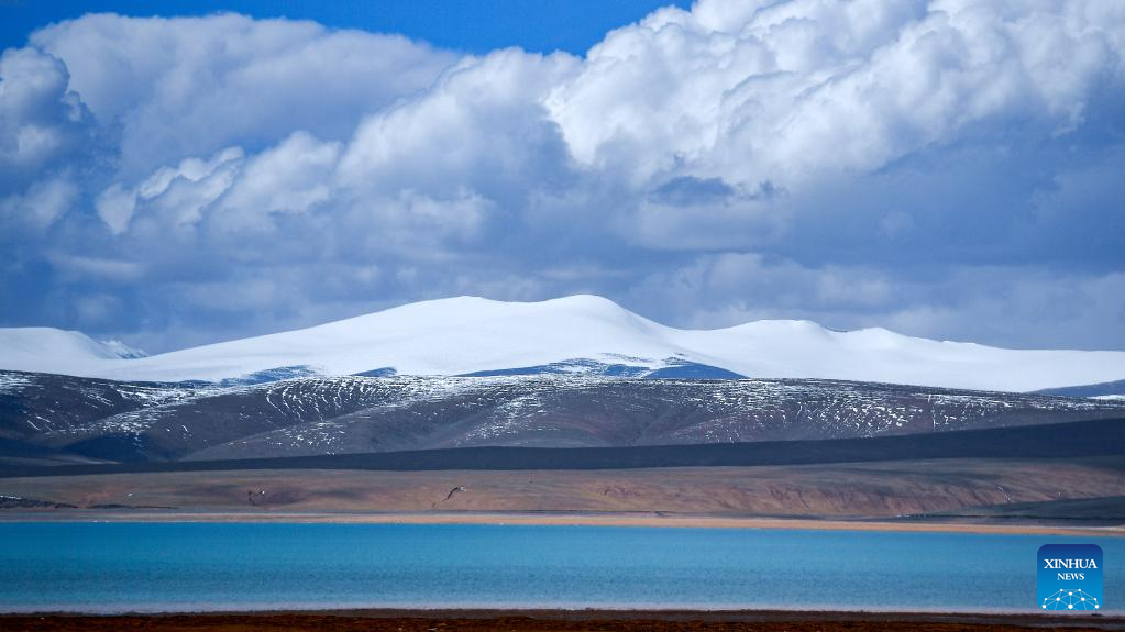 This photo taken on June 17, 2023 shows the Zonag Lake in Hoh Xil, northwest China's Qinghai Province. The Zonag Lake region in the Hoh Xil National Nature Reserve boasts splendid views of snow mountains, lakes and grasslands. The region also serves as a vital birthing ground for pregnant Tibetan antelopes who arrive between May and July to deliver their offspring. (Xinhua/Pan Binbin)