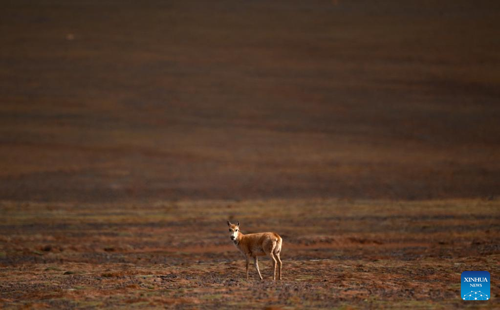 A Tibetan antelope is seen near the Zonag Lake in Hoh Xil, northwest China's Qinghai Province, June 17, 2023. The Zonag Lake region in the Hoh Xil National Nature Reserve boasts splendid views of snow mountains, lakes and grasslands. The region also serves as a vital birthing ground for pregnant Tibetan antelopes who arrive between May and July to deliver their offspring. (Xinhua/Zhang Hongxiang)