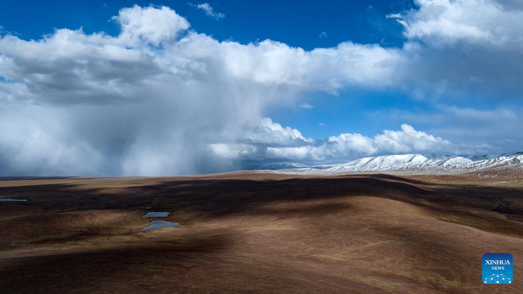 This aerial photo taken on June 17, 2023 shows scenery near the Zonag Lake in Hoh Xil, northwest China's Qinghai Province. The Zonag Lake region in the Hoh Xil National Nature Reserve boasts splendid views of snow mountains, lakes and grasslands. The region also serves as a vital birthing ground for pregnant Tibetan antelopes who arrive between May and July to deliver their offspring. (Xinhua/Han Fangfang)