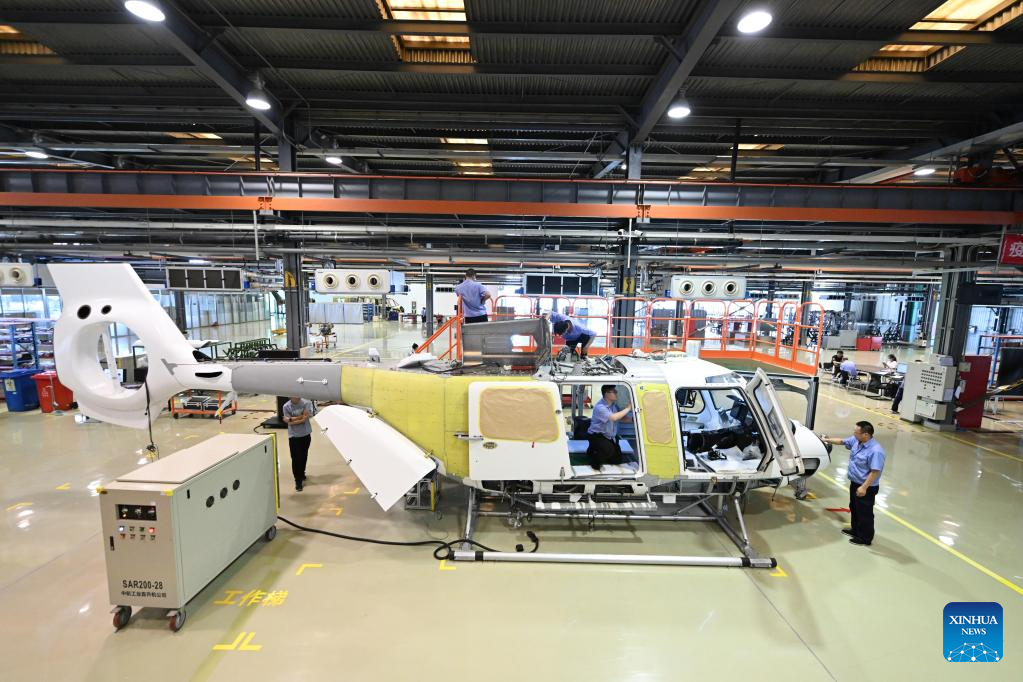 Staff members assemble an AC332 civil helicopter at the Aviation Industry Corporation of China (AVIC) Tianjin Helicopter Co., Ltd. in north China's Tianjin, June 20, 2023. The company has been boosting the development of civil helicopters industry and is now able to produce civil helicopters including AC312E, AC332 and AC352. (Xinhua/Sun Fanyue)