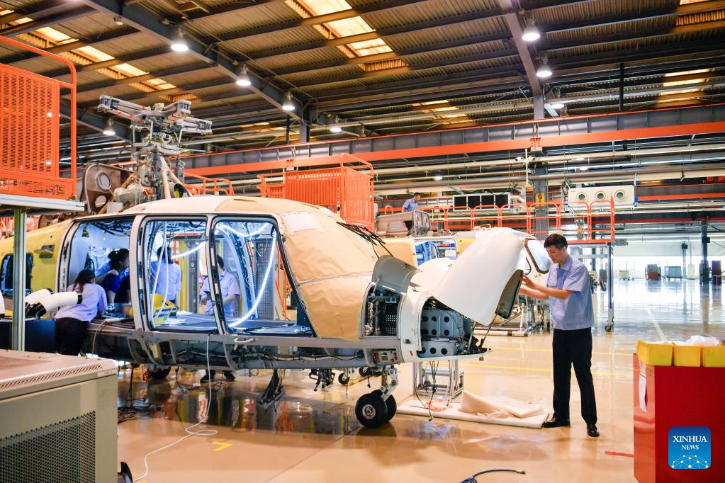 Staff members assemble an AC312E civil helicopter at the Aviation Industry Corporation of China (AVIC) Tianjin Helicopter Co., Ltd. in north China's Tianjin, June 20, 2023. The company has been boosting the development of civil helicopters industry and is now able to produce civil helicopters including AC312E, AC332 and AC352. (Xinhua/Sun Fanyue)