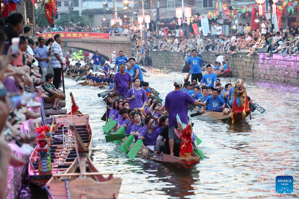 A nighttime dragon boat race is held to celebrate the Dragon Boat Festival in Sanxi Village of Changle District, Fuzhou, capital of southeast China's Fujian Province, June 20, 2023.