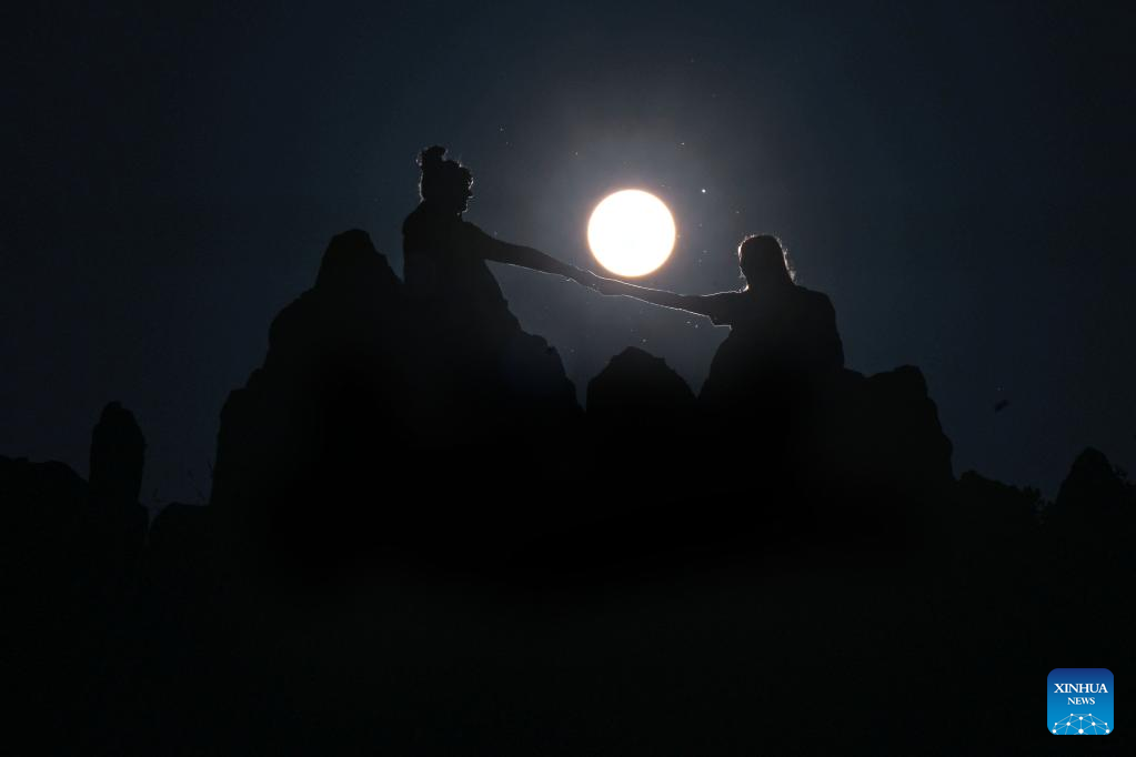 People pose for a photo as the sun rises on the summer solstice at the ancient megalithic observatory of Kokino, North Macedonia, June 21, 2023. (Photo by Tomislav Georgiev/Xinhua)