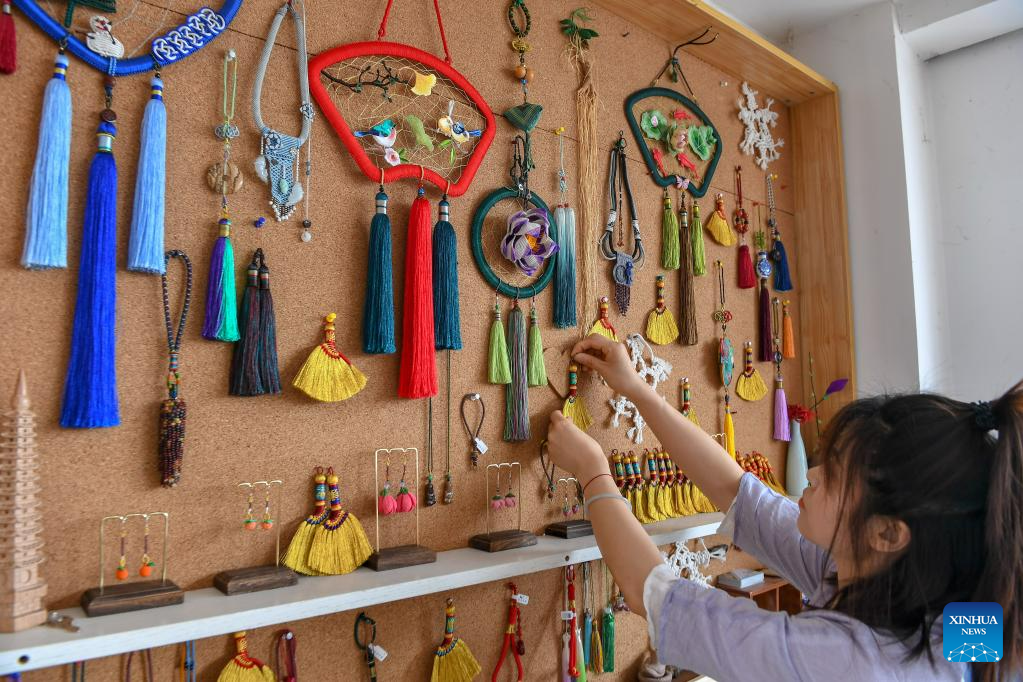 Xu Xiaoxue adjusts string-woven handicrafts at her studio in Changchun, northeast China's Jilin Province, June 20, 2023.