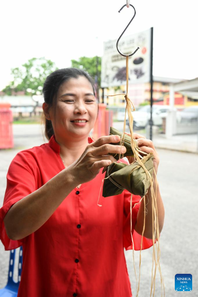 A woman makes Zongzi, a pyramid-shaped dumpling made of glutinous rice wrapped in bamboo or reed leaves, in Malacca, Malaysia, June 18, 2023. Activities like Zongzi making and dragon boat race were held in Malacca to greet the upcoming Dragon Boat Festival. (Xinhua/Cheng Yiheng)