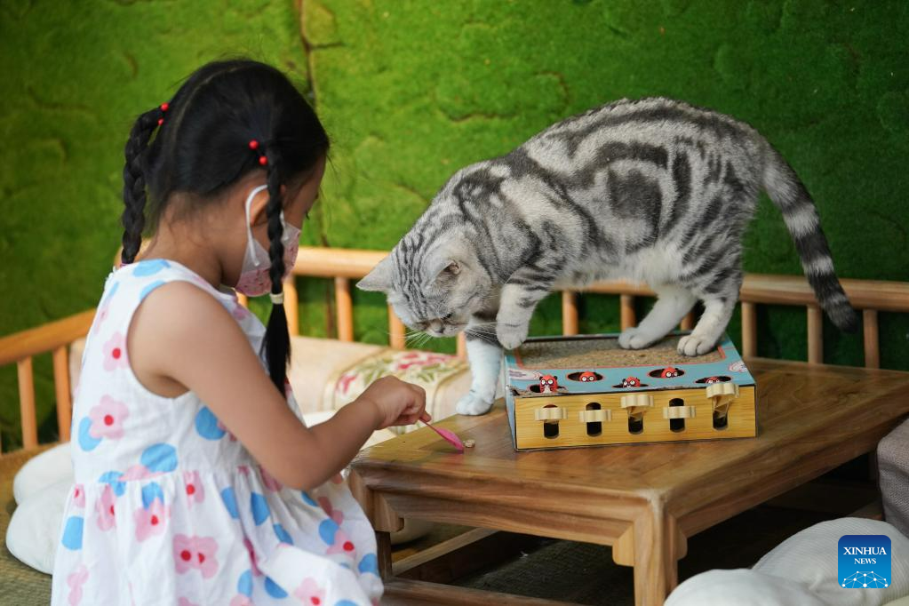 A young girl interacts with cat Weiya at Gudaomaone cat cafe in Xiaojuer Hutong of the Nanluoguxiang neighborhood in Beijing, capital of China, on June 10, 2023.