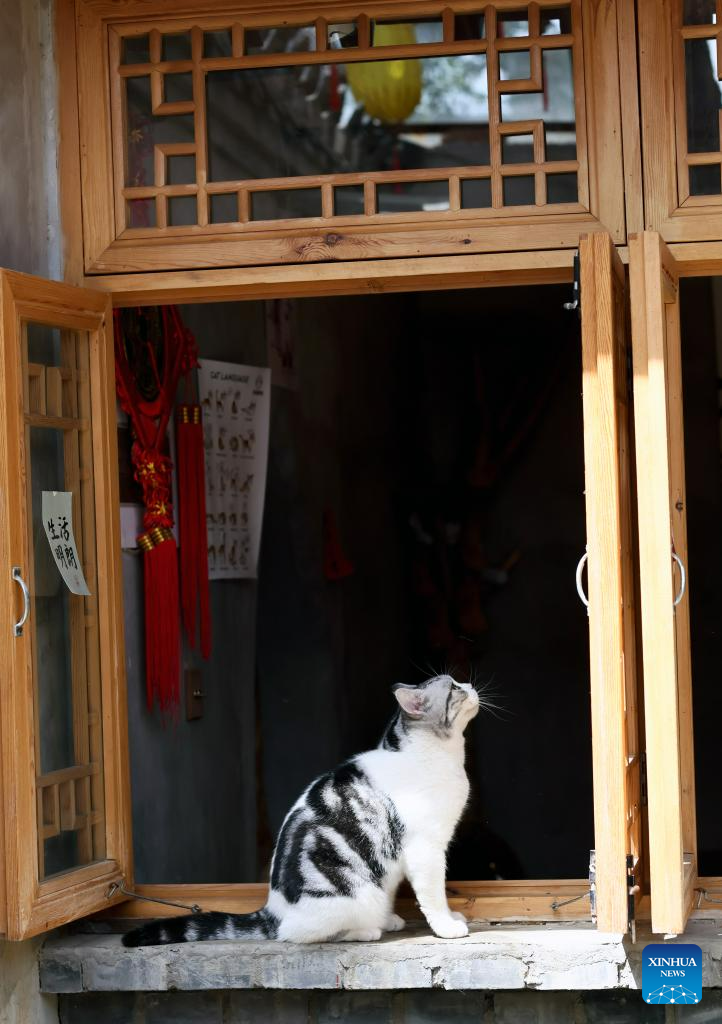 Cat Tongbao crouches on a window sill at Gudaomaone cat cafe in Xiaojuer Hutong of the Nanluoguxiang neighborhood in Beijing, capital of China, on June 7, 2023.