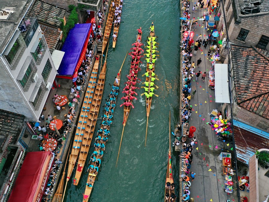 This aerial photo taken on June 18, 2023 shows a nighttime dragon boat race held to celebrate the Dragon Boat Festival in Sanxi Village of Changle District, Fuzhou, capital of southeast China's Fujian Province. (Xinhua/Jiang Kehong)