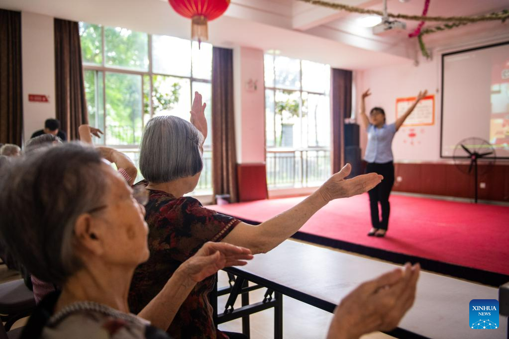 Senior residents dance following the guidance of a staff member at a social welfare center in Hanshou County of Changde City, central China's Hunan Province, June 20, 2023.