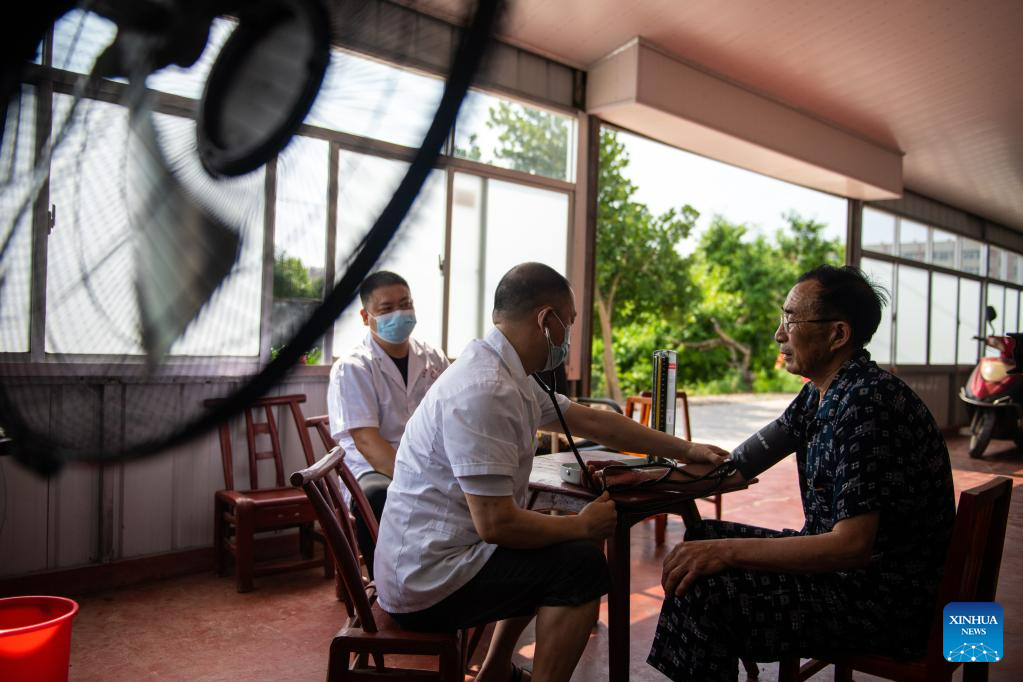 A medical worker (1st R) conducts medical examination for a senior resident at a nursing home in Anxiang County of Changde City, central China's Hunan Province, June 21, 2023.