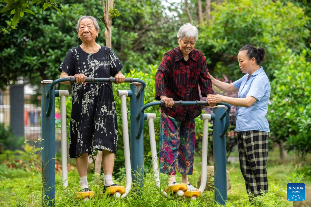 Senior residents exercise with the help of a staff member at a social welfare center in Hanshou County of Changde City, central China's Hunan Province, June 20, 2023.