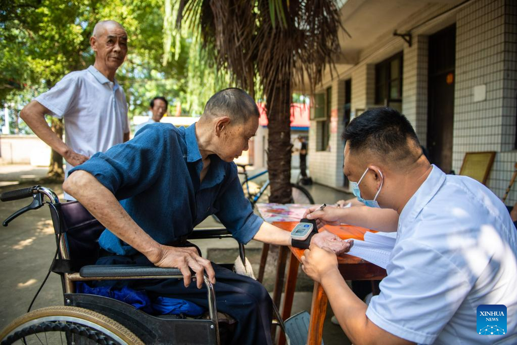A medical worker measures blood pressure for a senior resident at a community in Anxiang County of Changde City, central China's Hunan Province, June 21, 2023.