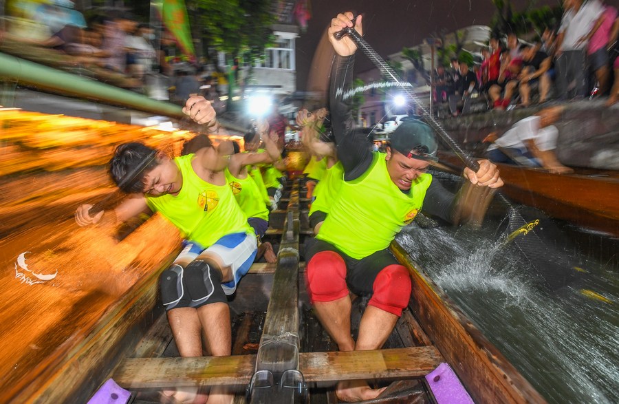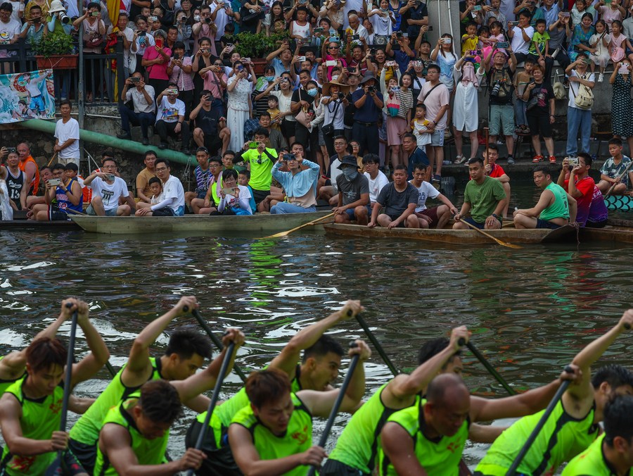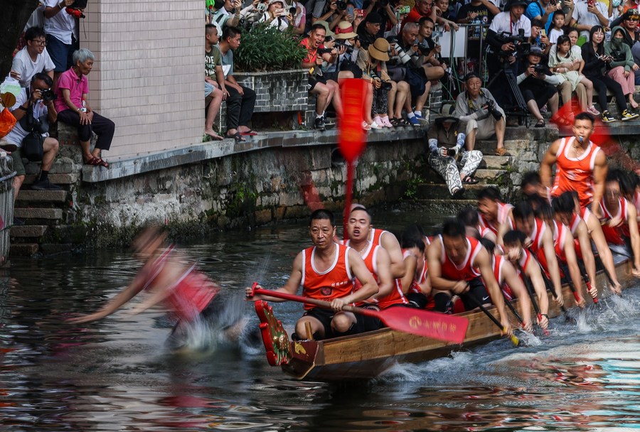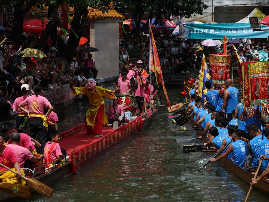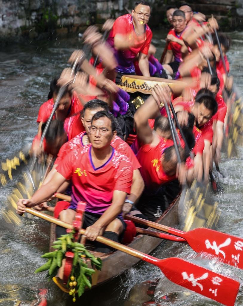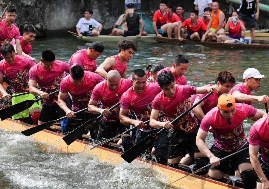 Participants take part in a dragon boat race in Diejiao Township of Foshan, south China's Guangdong Province, June 22, 2023. (Xinhua/Liu Dawei)