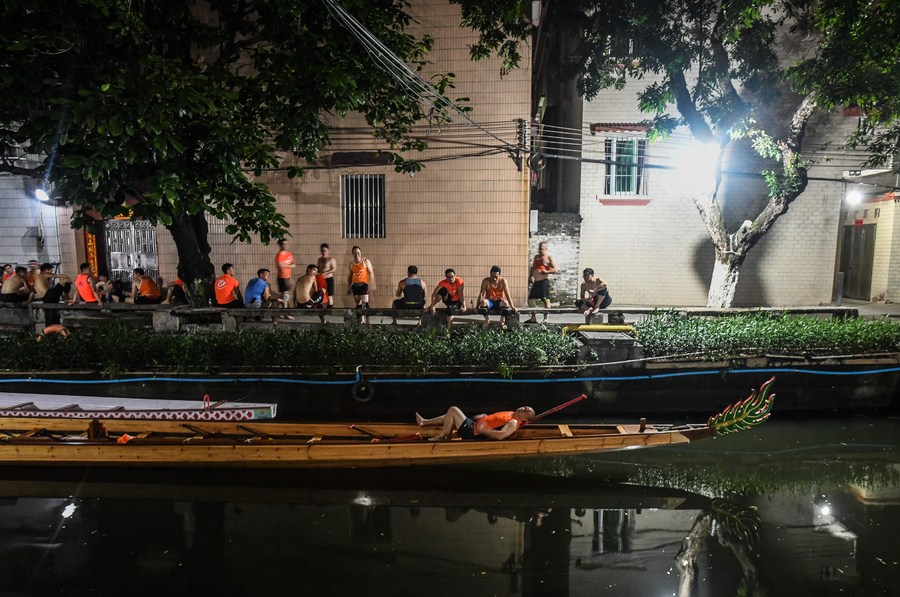 A participant rests on the dragon boat after a night training session in Diejiao Township of Foshan, south China's Guangdong Province, June 16, 2023. (Xinhua/Liu Dawei)