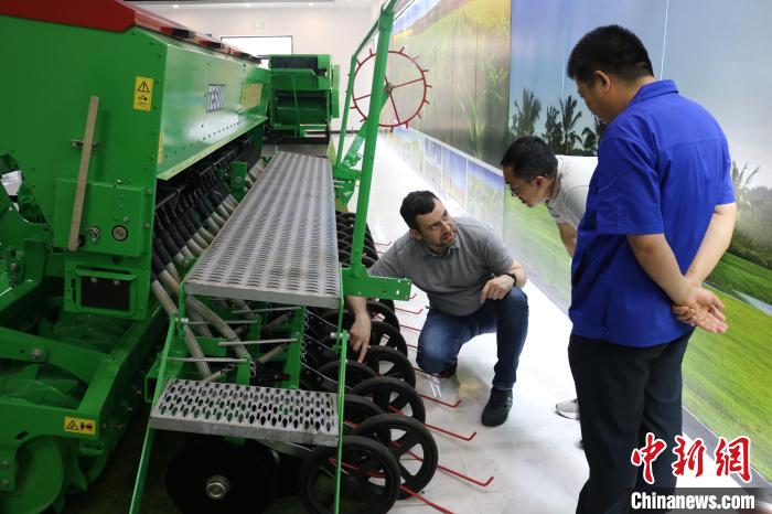 A client from Russia talks about the performance of an agricultural machine with representatives of an agricultural machinery manufacturer in Anqiu city, east China's Shandong Province. (Photo courtesy of the publicity department of the Party committee of Anqiu)