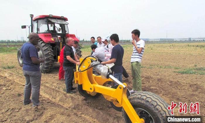 Technicians from Shandong Yuntai Machinery Co., Ltd. and their Cuban clients test disc plows in a field in Qihe county, east China's Shandong Province. (Photo courtesy of the publicity department of the Party committee of Qihe county)