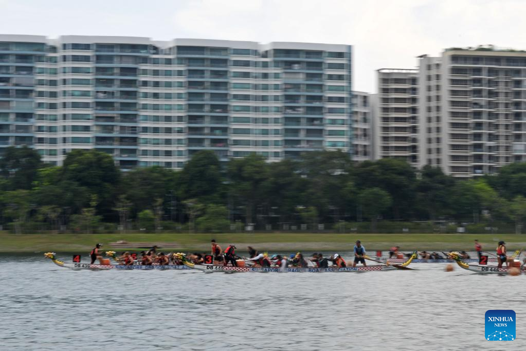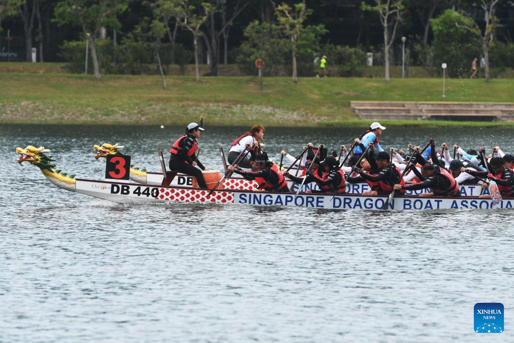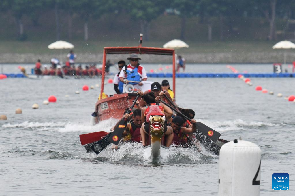 Dragon boat rowers compete during a dragon boat race as part of the Dragon Boat Festival celebrations in the Bedok Reservoir in Singapore, June 24, 2023. (Photo by Then Chih Wey/Xinhua)