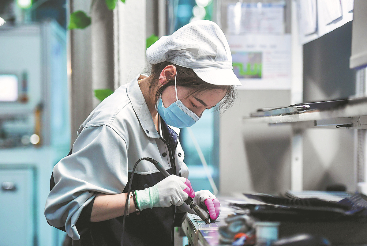 An employee works on the photovoltaic production line of a tech company in the Inner Mongolia autonomous region. [Photo/Xinhua]