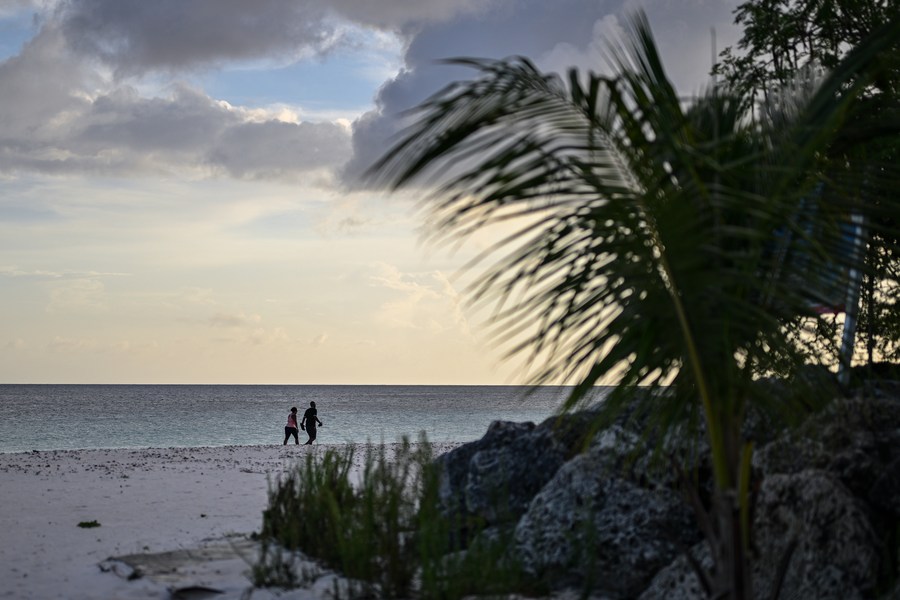 People walk on a beach in Bridgetown, capital of Barbados, June 1, 2023. (Xinhua/Xin Yuewei)