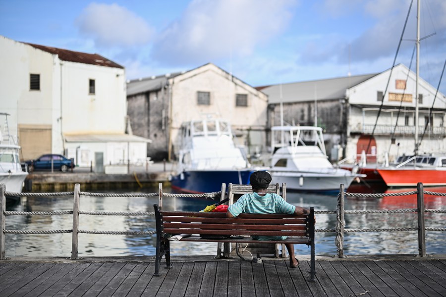 A man sits on a bench in Bridgetown, capital of Barbados, June 1, 2023. (Xinhua/Xin Yuewei)