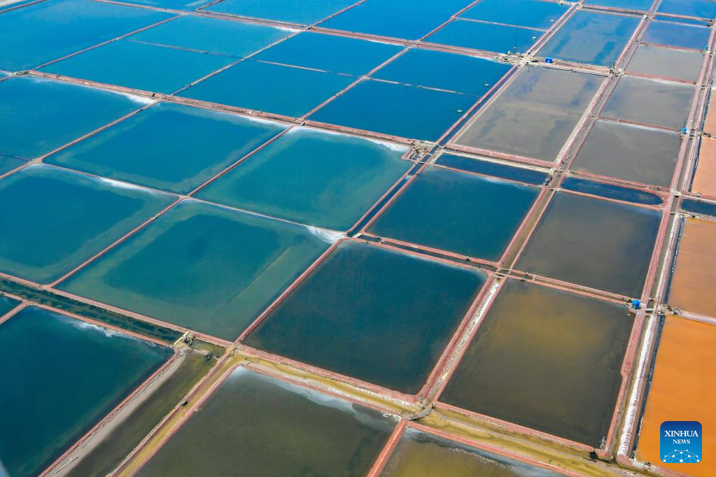 This aerial view taken on June 16, 2023 shows a saltworks in north China's Tianjin Municipality. (Xinhua/Sun Fanyue)