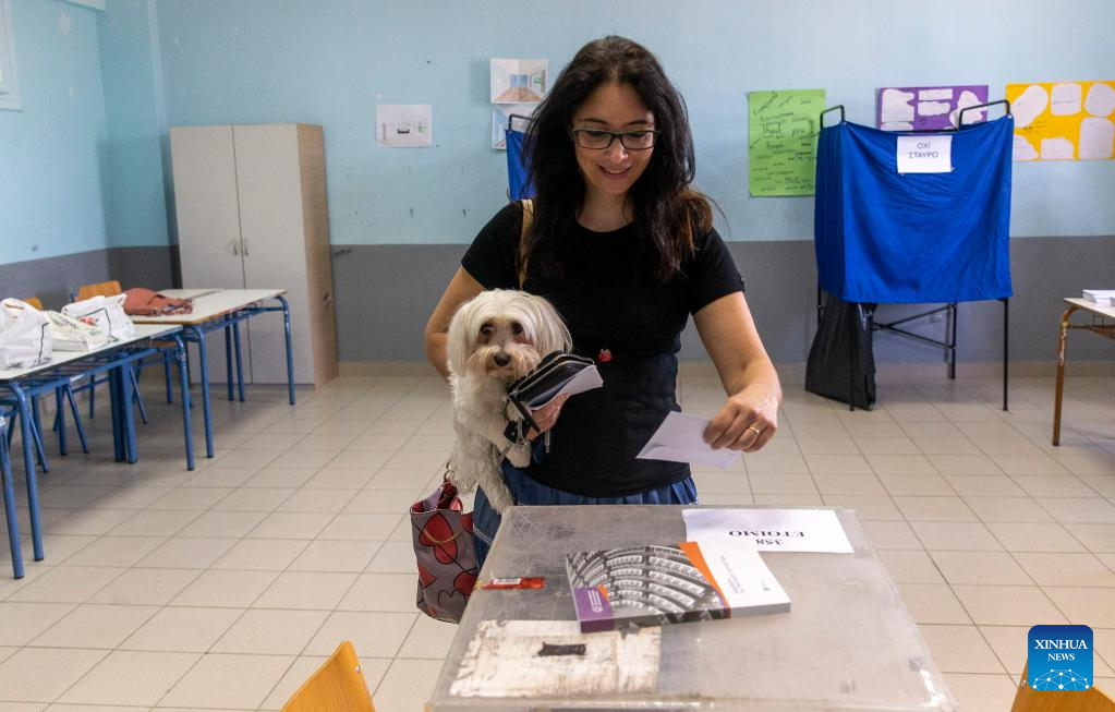A woman casts her ballot at a polling station in Athens, Greece, June 25, 2023. A second general election was held in Greece on Sunday. (Photo by Marios Lolos/Xinhua)