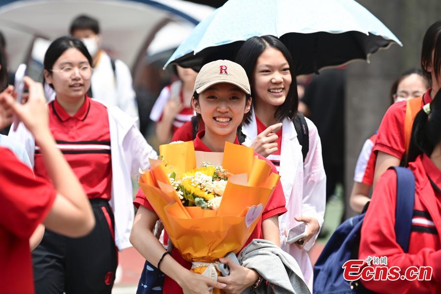 A student is greeted with a bouquet of flowers while walking out of an exam site at a high school in Beijing, June 26, 2023. (Photo: China News Service/Tian Yuhao)