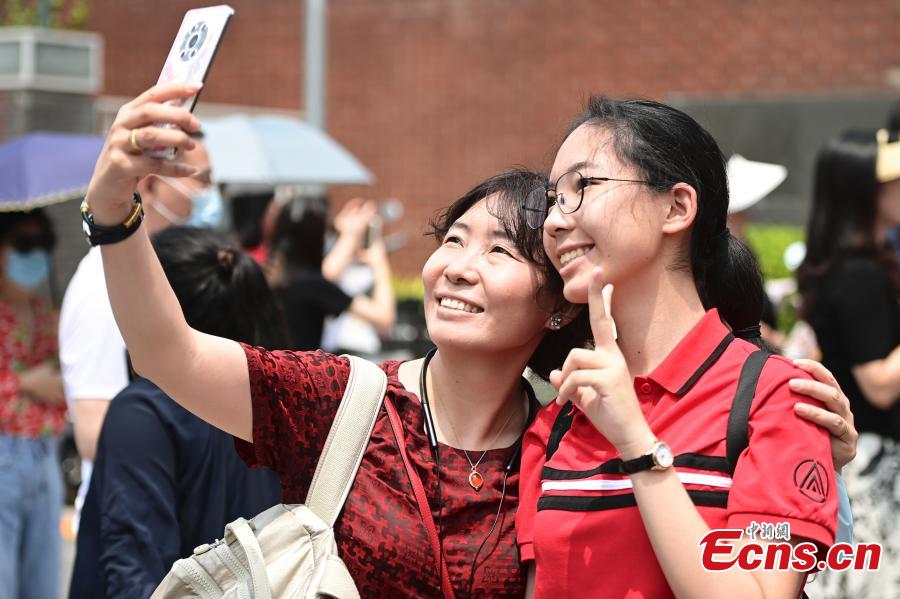 A student takes selfie with her mother outside an exam site at a high school in Beijing, June 26, 2023. (Photo: China News Service/Tian Yuhao)