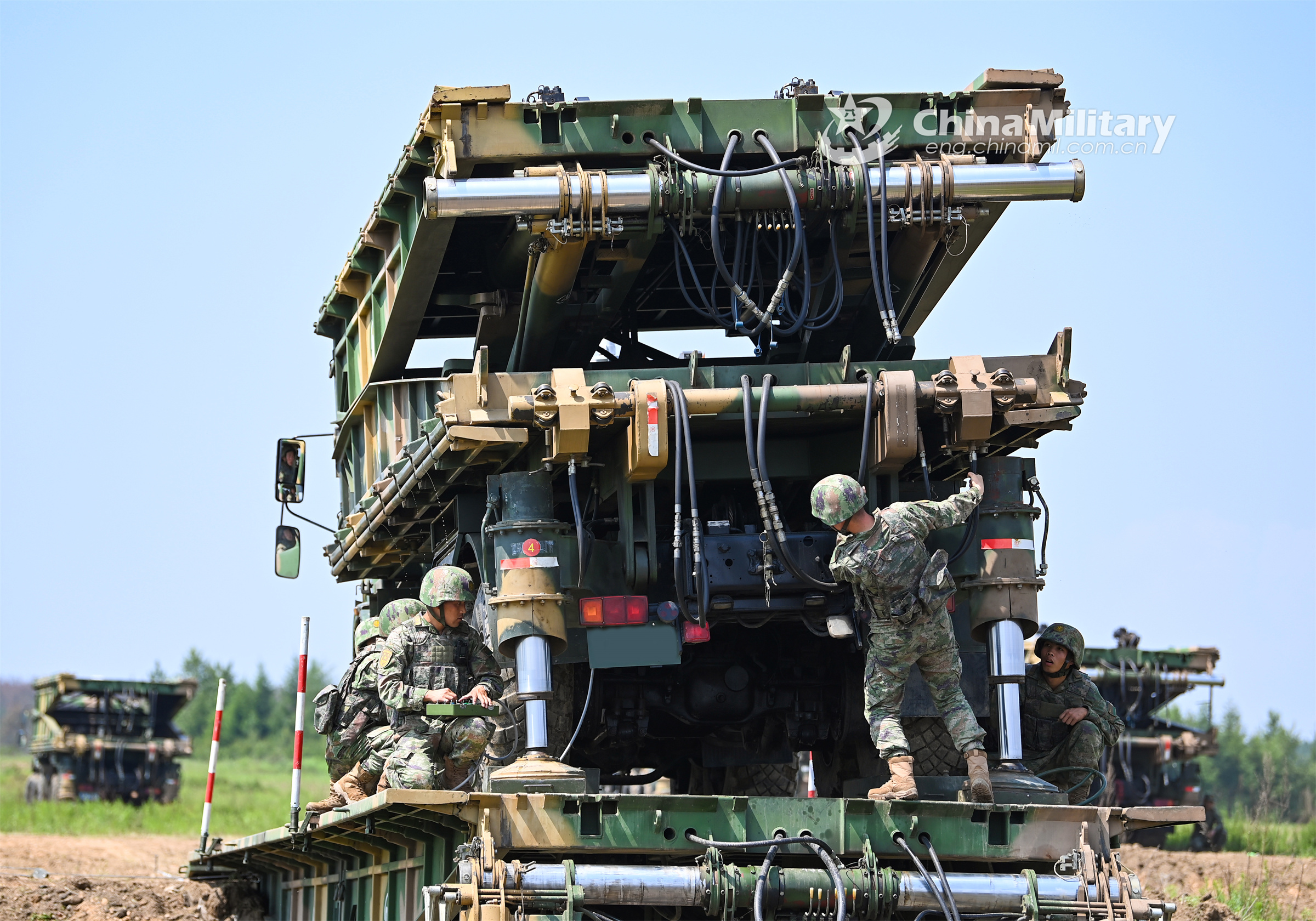 Soldiers assigned to a brigade under the PLA 78th Group Army assemble a trailer-launched bridge of the Rapidly Emplaced Bridge System (REBS) for temporary transportation during a bridge-building training exercise on June 18, 2023. (eng.chinamil.com.cn/Photo by Ding Bosong)