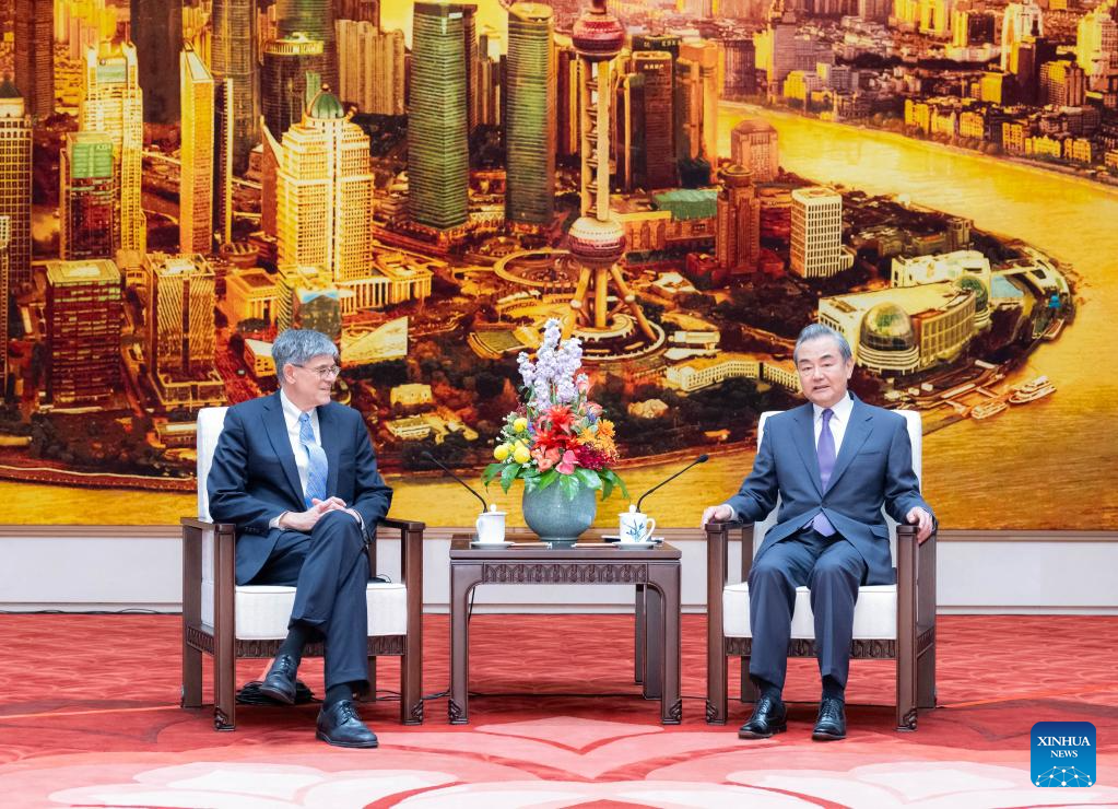 Wang Yi, a member of the Political Bureau of the Communist Party of China (CPC) Central Committee and director of the Office of the Foreign Affairs Commission of the CPC Central Committee, meets with the chairman of the National Committee on U.S.-China Relations (NCUSCR) Jacob Lew, vice chair of the NCUSCR Evan Greenberg, and president of the NCUSCR Stephen Orlins in Beijing, capital of China, June 26, 2023. (Xinhua/Zhai Jianlan)