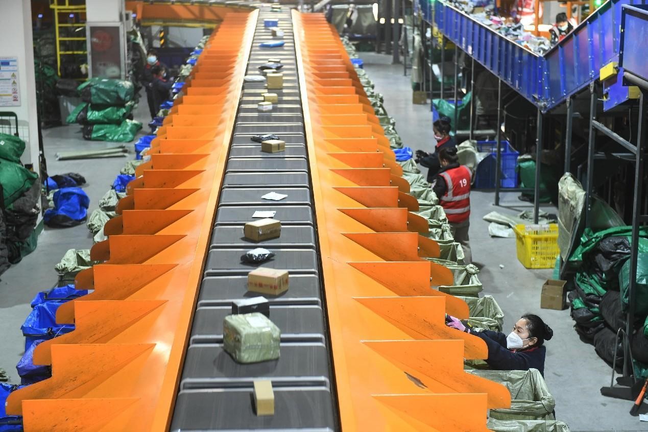 In a 150,000-square-meter distribution center of Chinese express delivery firm Yunda Express in Liuyang, central China's Hunan province, trucks loaded with parcels were busy working on 34 unloading platforms at midnight.