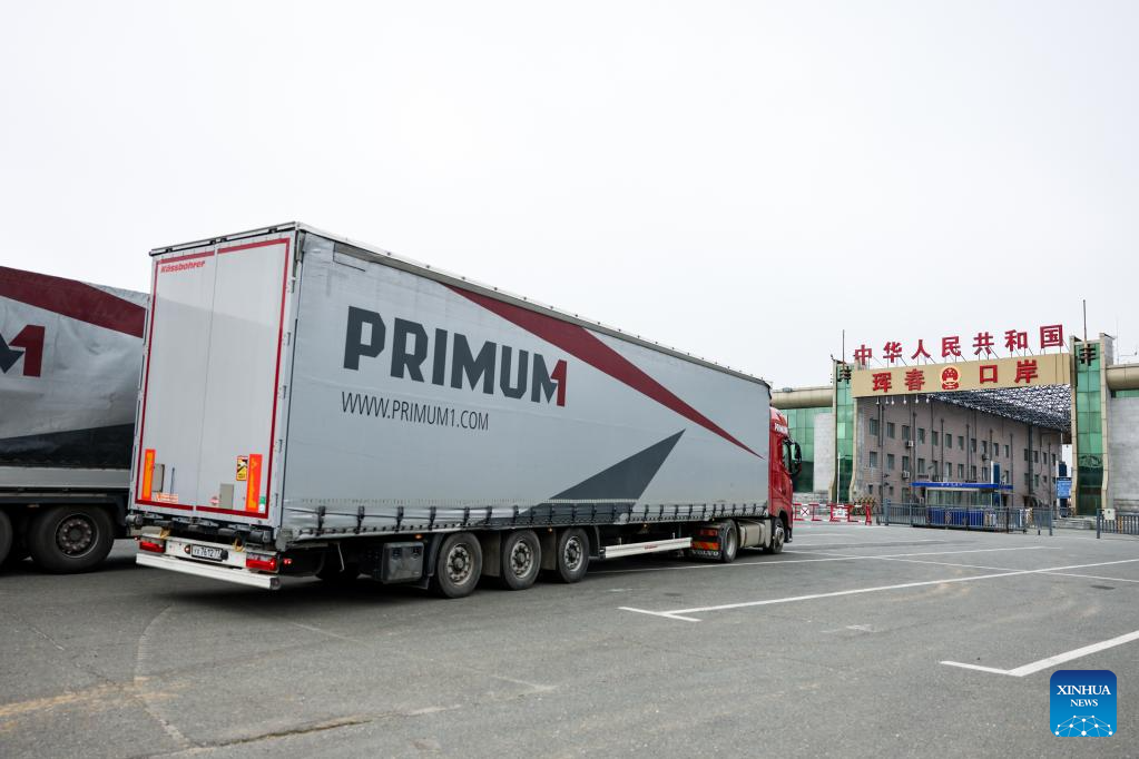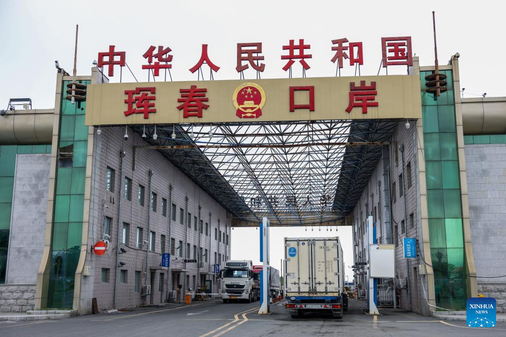 Trucks leave for Russia at the highway port in Hunchun City, northeast China's Jilin Province, June 26, 2023. Hunchun borders Russia and the Democratic People's Republic of Korea, and serves as the only port city of Jilin Province to Russia. More than 73,000 counts of persons and over 16,000 counts of vehicles have passed through the Hunchun highway port so far this year. (Xinhua/Yan Linyun)