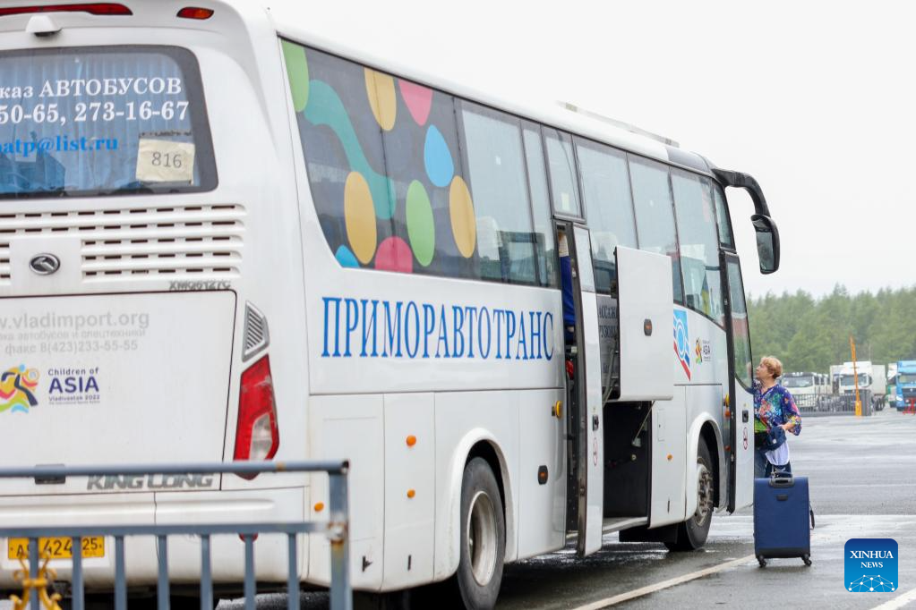 A traveller boards a tourist bus at the highway port in Hunchun City, northeast China's Jilin Province, June 27, 2023. Hunchun borders Russia and the Democratic People's Republic of Korea, and serves as the only port city of Jilin Province to Russia. More than 73,000 counts of persons and over 16,000 counts of vehicles have passed through the Hunchun highway port so far this year. (Xinhua/Yan Linyun)