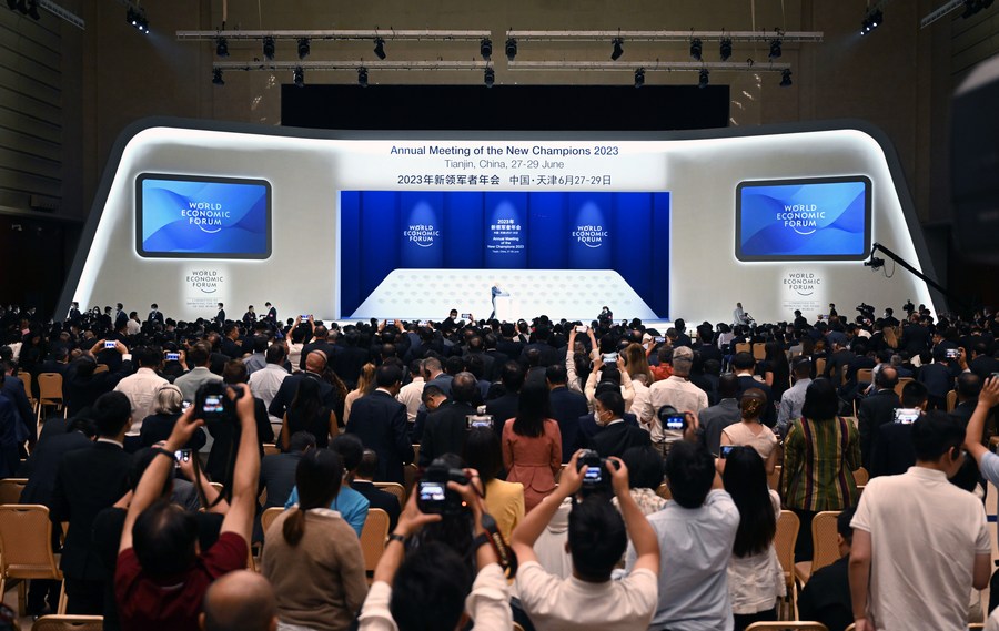This photo taken on June 27, 2023 shows the opening ceremony of the 14th Annual Meeting of the New Champions, also known as the Summer Davos, in north China's Tianjin Municipality. (Xinhua/Zhao Zishuo)
