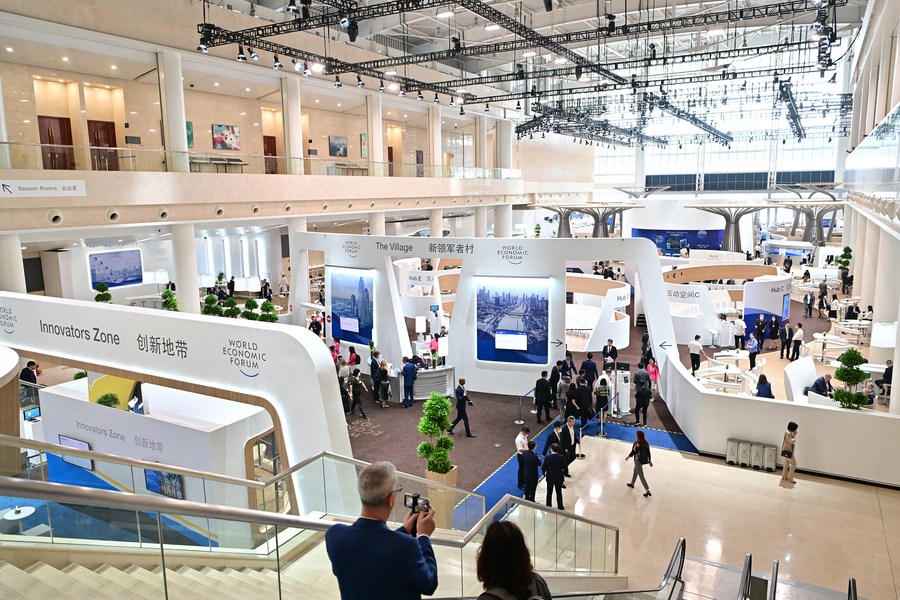 This photo taken on June 27, 2023 shows a view of the venue for the 14th Annual Meeting of the New Champions, also known as the Summer Davos, in north China's Tianjin Municipality. (Xinhua/Sun Fanyue)