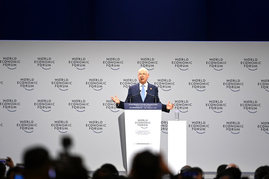 Executive Chairman of the World Economic Forum (WEF) Klaus Schwab speaks at the opening ceremony of the 14th Annual Meeting of the New Champions, also known as the Summer Davos, in north China's Tianjin Municipality, June 27, 2023. (Xinhua/Zhao Zishuo)