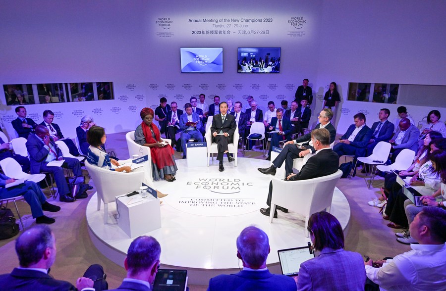 Participants attend a session themed "Pulling Together for the Energy Transition" of the 14th Annual Meeting of the New Champions, also known as the Summer Davos, in north China's Tianjin Municipality, June 27, 2023. (Xinhua/Sun Fanyue)