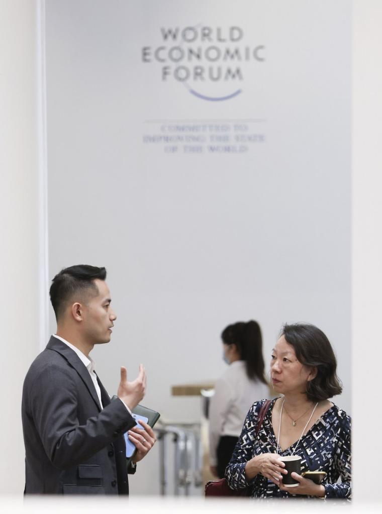 Participants talk at the venue of the 14th Annual Meeting of the New Champions, also known as the Summer Davos, in north China's Tianjin Municipality, June 27, 2023. (Xinhua/Li Ran)